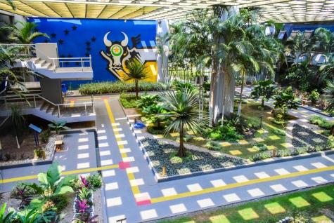 Com cores fortes e formas geométricas, o painel retrata a história da Fórmula 1