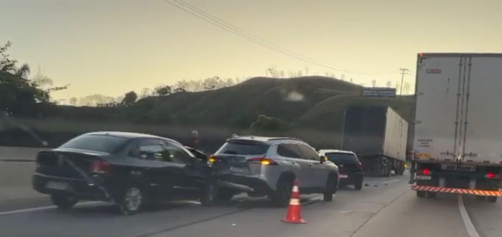 Colisão envolveu três carros e um caminhão no fim da tarde desta quinta-feira (23).