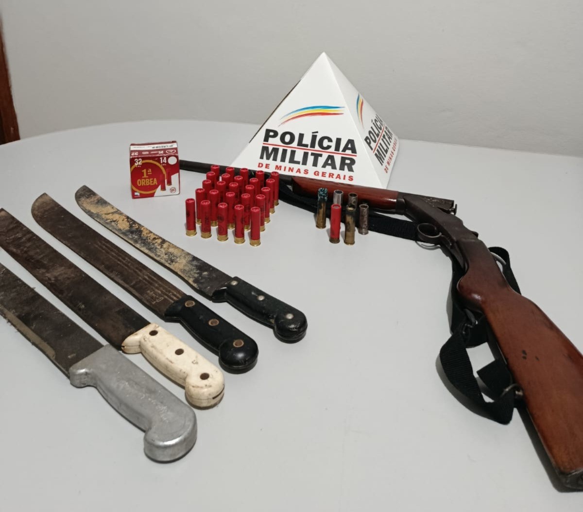 Policiais apreenderam arma, munições e facões.